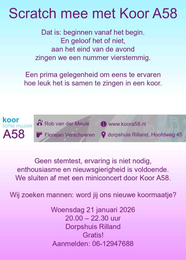 Wat voert ons, zangers en zangeressen uit Zeeland en West-Brabant, iedere woensdagavond naar onze repetitielocatie in Rilland? Inderdaad, rijksweg A58. Daarmee is deze provinciale verkeersader een originele naamgever!