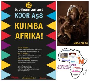 Ons jubileum is een groots feest geworden. We brachten het programma Kuimba Afrika! in 3 uitverkochte zalen in de Concertzaal in Middelburg en ‘thuis’ in Rilland. Met percussie en slagwerk door Cora Dellebeke en Elmarye Theune kwamen de Afrikaanse songs tot leven. En dankzij de Vrienden van Koor A58 mochten we samenwerken en genieten van zangeres Vimbai Zimuto met haar percussionist Racine Dione.